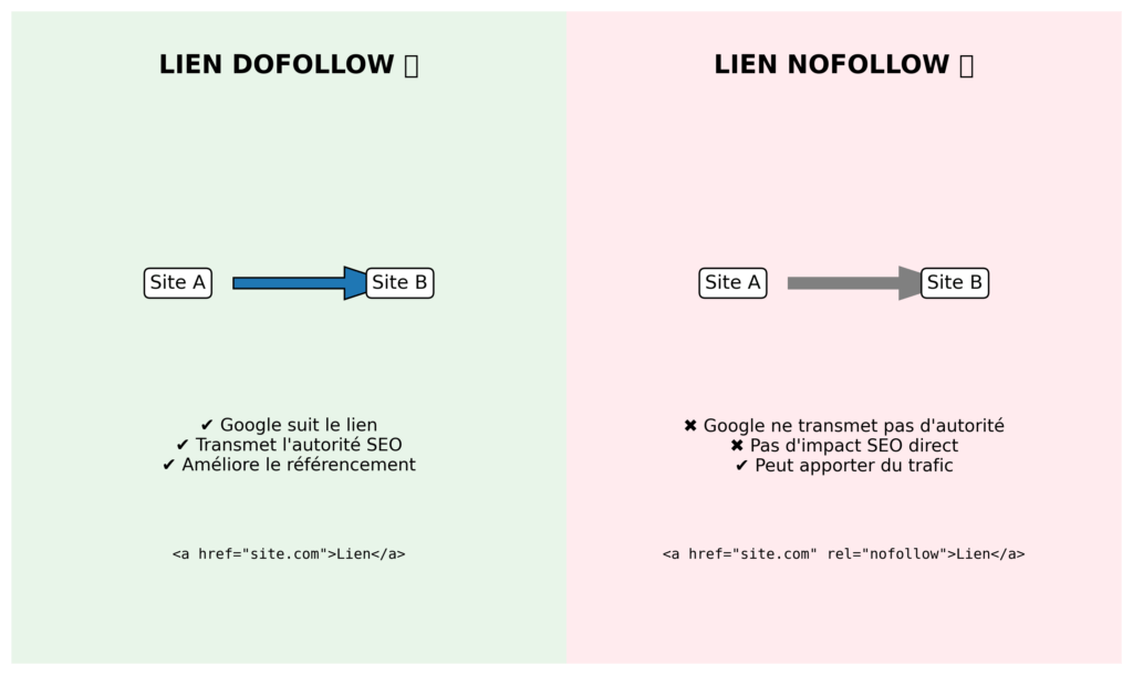 En NOFOLLOW, vous allez voir : <a href= »https://exemple.com » rel= »nofollow »>Mon lien</a>
